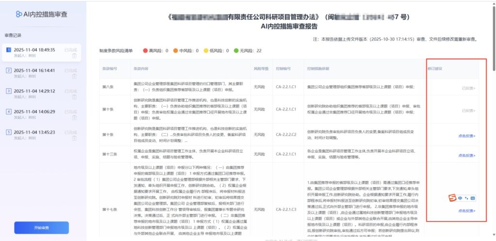 • 全維度風險識別: 系統能夠全面、精準地識別企業制度中不符合內控管理規範的潛在風險 。