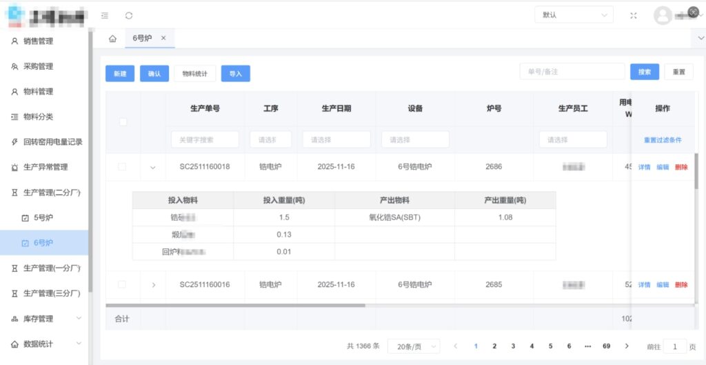 • 生產流程透明化: 詳細記錄每一批次(如 SC2511160018)的生產數據,包括生產單號、工廠、生產日期、設備、爐號及員工等信息 。
