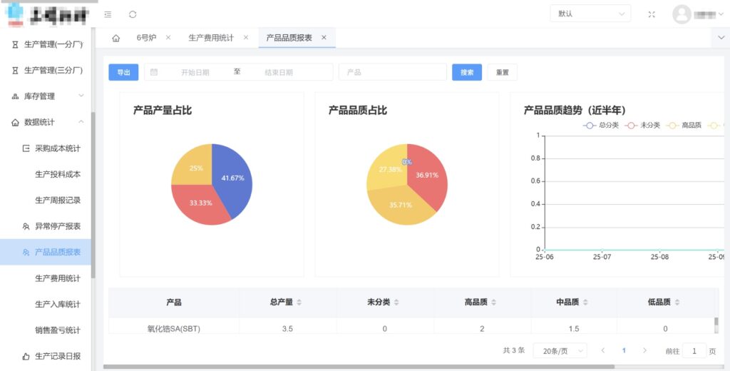• 產品產量與品質佔比: 通過直觀的圓餅圖展示不同產品的產量佔比和品質等級(優、中、低品)的佔比情況 。